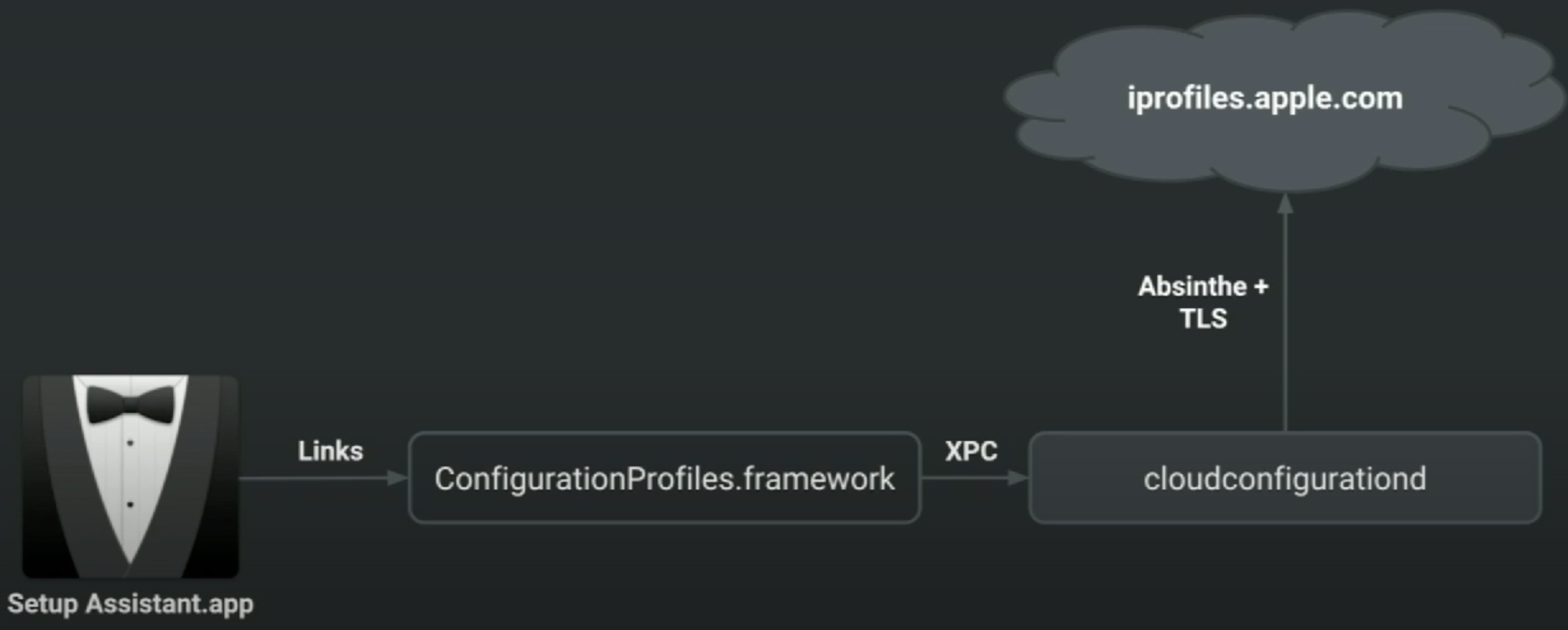 cloudconfigurationdvia XPC. Die “Setup Assistant” (wanneer die toestel vir die eerste keer opgestart word) of dieprofilesopdrag sal hierdie daemon kontak om die aktiveringsrekord te verkry. - LaunchDaemon (loop altyd as root)