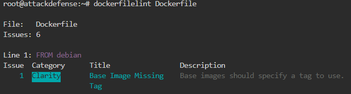 - Puedes usar la herramienta https://github.com/buddy-works/dockerfile-linter para inspeccionar tu Dockerfile y encontrar todo tipo de malas configuraciones. Cada mala configuración se le asignará un ID, puedes encontrar aquí https://github.com/buddy-works/dockerfile-linter/blob/master/Rules.md cómo corregir cada una de ellas.