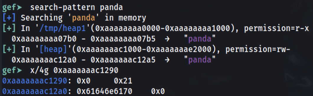 यह देखा जा सकता है कि string panda 0xaaaaaaac12a0 पर स्टोर था (जो कि x0 के अंदर malloc द्वारा लौटाया गया address था)। 0x10 bytes पहले जांचने पर देखा जा सकता है कि 0x0 दर्शाता है कि previous chunk is not used (लंबाई 0) और इस chunk की लंबाई 0x21 है।
