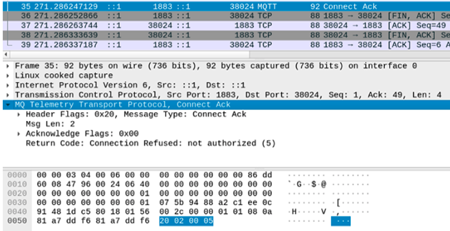 उदाहरण के लिए, यदि ब्रोकर अमान्य क्रेडेंशियल के कारण कनेक्शन अस्वीकार कर देता है, तो परिदृश्य कुछ इस तरह दिखाई देगा: