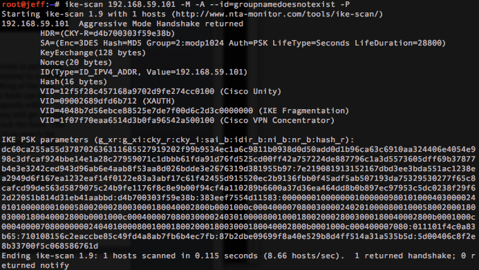 Ending ike-scan 1.9: 1 hosts scanned in 0.015 seconds (65.58 hosts/sec). 1 returned handshake; 0 returned notify