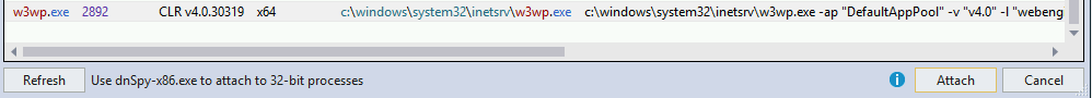 फिर w3wp.exe का चयन करें ताकि IIS server से जुड़ सकें और attach पर क्लिक करें: