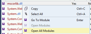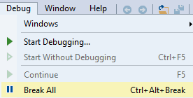 अब जब हम प्रक्रिया को डिबग कर रहे हैं, तो इसे रोकने और सभी मॉड्यूल लोड करने का समय है। पहले Debug >> Break All पर क्लिक करें और फिर Debug >> Windows >> Modules पर क्लिक करें: