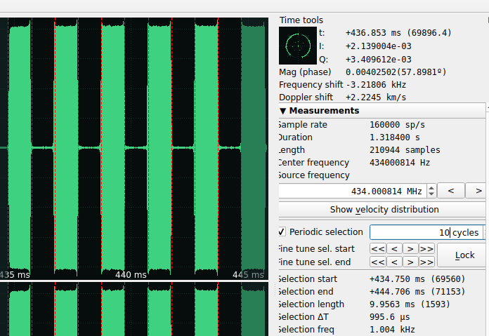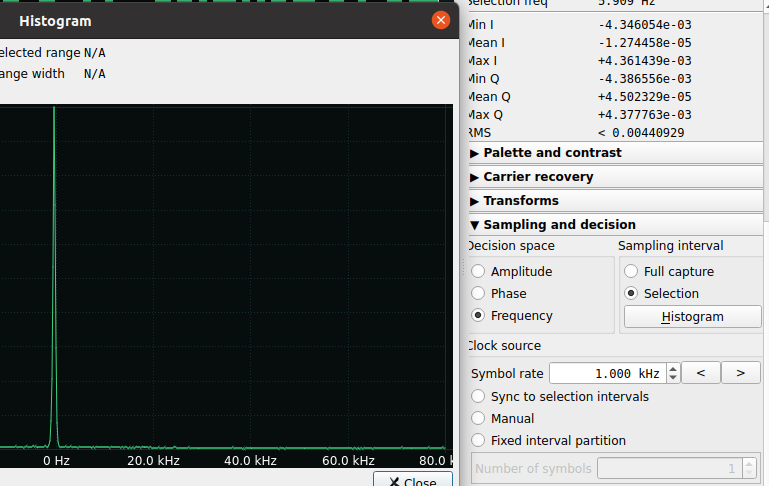आप यह भी संकेत कर सकते हैं कि आप कितने प्रतीकों का चयन करने जा रहे हैं और SigDigger 1 प्रतीक की आवृत्ति की गणना करेगा (जितने अधिक प्रतीक चुने जाएंगे, उतना ही बेहतर होगा)। इस परिदृश्य में मैंने 10 प्रतीकों का चयन किया और “चयन आवृत्ति” 1.004 Khz है: