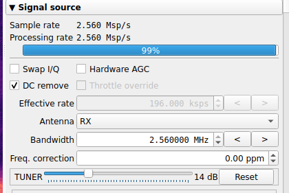 - SigDigger का Tuner बेहतर सिग्नल कैप्चर करने में मदद करता है (लेकिन यह उन्हें degrade भी कर सकता है)। आदर्श रूप से 0 से शुरू करें और इसे बड़ा बनाते रहें जब तक आप शोर को न देखें जो सिग्नल में सुधार से बड़ा है।