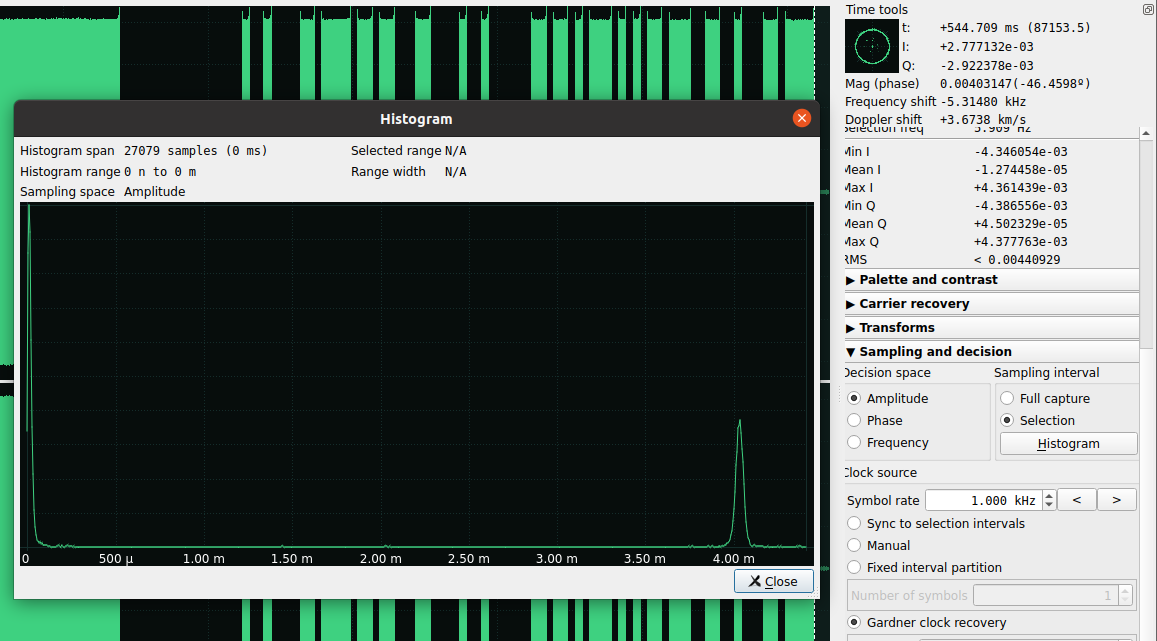 आप संपूर्ण सिग्नल का चयन कर सकते हैं जहां जानकारी स्थित है, एम्प्लीट्यूड मोड और चयन का चयन करें और हिस्टोग्राम पर क्लिक करें। आप देख सकते हैं कि केवल 2 स्पष्ट स्तर पाए जाते हैं।