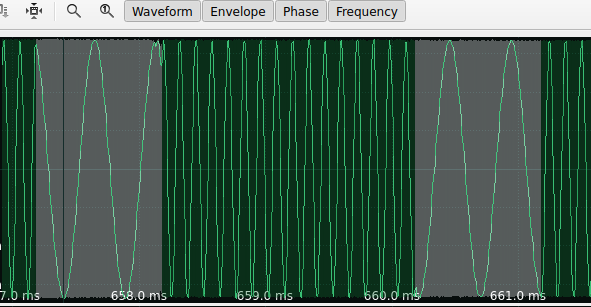 SigDigger के साथ AM जानकारी की जांच करते समय और बस एंवेलप को देखते हुए आप विभिन्न स्पष्ट एम्प्लीट्यूड स्तर देख सकते हैं। उपयोग किया गया सिग्नल AM में जानकारी के साथ पल्स भेज रहा है, यह एक पल्स कैसे दिखता है: