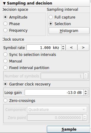 यह पता लगाने के बाद कि यह एक AM मोड्यूलेटेड सिग्नल है और प्रतीक दर (और यह जानते हुए कि इस मामले में कुछ ऊपर का मतलब 1 है और कुछ नीचे का मतलब 0 है), सिग्नल में एन्कोडेड बिट्स प्राप्त करना बहुत आसान है। इसलिए, जानकारी के साथ सिग्नल का चयन करें और सैंपलिंग और निर्णय कॉन्फ़िगर करें और सैंपल दबाएं (जांचें कि एम्प्लीट्यूड चयनित है, खोजी गई प्रतीक दर कॉन्फ़िगर की गई है और गैडनर क्लॉक रिकवरी चयनित है):