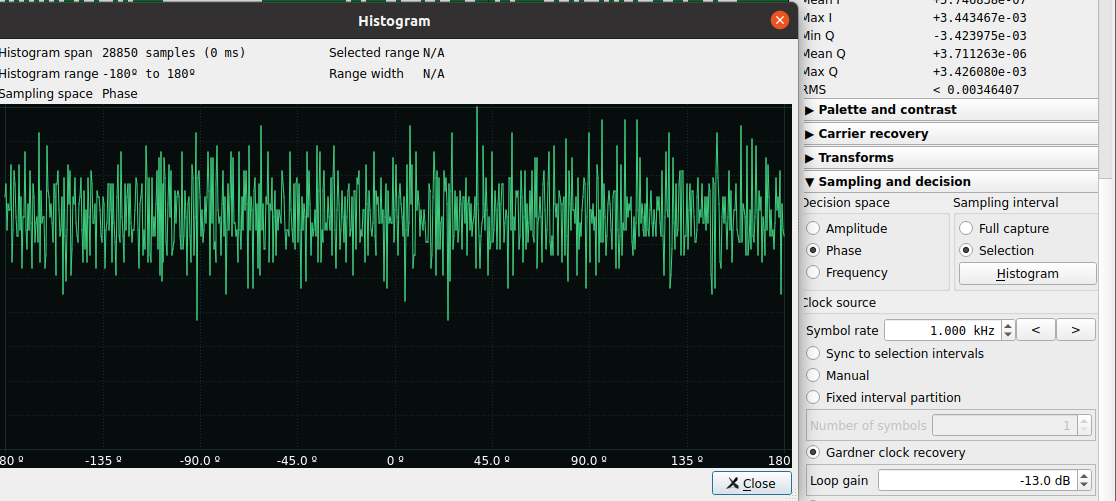 यदि सिग्नल में प्रतीक प्रति बिट 1 से अधिक है (उदाहरण के लिए 2), तो SigDigger के पास यह जानने का कोई तरीका नहीं होगा कि कौन सा प्रतीक 00, 01, 10, 11 है, इसलिए यह प्रत्येक का प्रतिनिधित्व करने के लिए विभिन्न ग्रे स्केल का उपयोग करेगा (और यदि आप बिट्स को कॉपी करते हैं, तो यह 0 से 3 तक के नंबर का उपयोग करेगा, आपको उन्हें संसाधित करने की आवश्यकता होगी)।