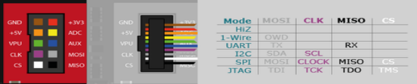 ध्यान दें कि भले ही Pirate Bus का PINOUT MOSI और MISO के लिए SPI से कनेक्ट करने के लिए पिन दिखाता है, कुछ SPIs पिन को DI और DO के रूप में दिखा सकते हैं। MOSI -> DI, MISO -> DO