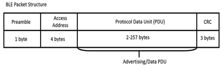 preamble byte फ़्रीक्वेंसी को सिंक्रनाइज़ करता है, जबकि चार-बाइट का access address एक connection identifier है, जो उन परिदृश्यों में उपयोग होता है जहाँ एक ही चैनलों पर कई डिवाइस कनेक्शन स्थापित करने की कोशिश कर रहे होते हैं। इसके बाद, Protocol Data Unit (PDU) में advertising data होता है। PDU के कई प्रकार होते हैं; सबसे सामान्य रूप से उपयोगी हैं ADV_NONCONN_IND और ADV_IND। डिवाइस ADV_NONCONN_IND PDU प्रकार का उपयोग करते हैं यदि वे कनेक्शन स्वीकार नहीं करते हैं, और केवल advertising packet में ही डेटा ट्रांसमिट करते हैं। डिवाइस ADV_IND का उपयोग करते हैं यदि वे कनेक्शंस की अनुमति देते हैं और एक connection स्थापित होने पर advertising पैकेट्स भेजना रोक देते हैं।