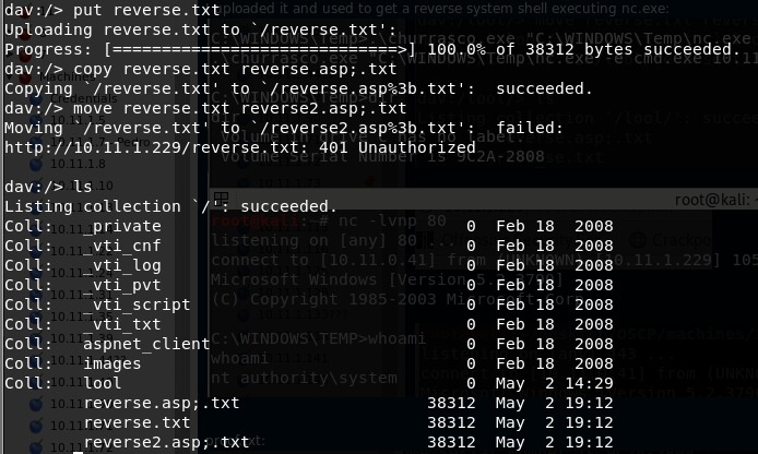 Poi puoi caricare il tuo shell come un file “.**txt” e copiare/spostarlo in un file “.asp;.txt”. Accedendo a quel file tramite il server web, esso sarà eseguito (cadaver dirà che l’azione di spostamento non ha funzionato, ma ha funzionato).