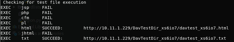 Davtest prova a caricare diversi file con estensioni diverse e controlla se l’estensione viene eseguita: