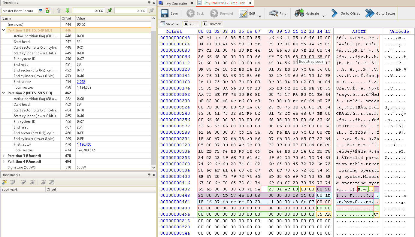 ArsenalImageMounter๋ก ํฌ๋ ์ ์ด๋ฏธ์ง๋ฅผ ๋ง์ดํธํ ํ, Windows ๋๊ตฌ์ธ Active Disk Editor๋ฅผ ์ฌ์ฉํ์ฌ ์ฒซ ๋ฒ์งธ ์นํฐ๋ฅผ ๊ฒ์ฌํ ์ ์์ต๋๋ค. ๋ค์ ์ด๋ฏธ์ง์์ ์นํฐ 0์์ MBR์ด ๊ฐ์ง๋๊ณ ํด์๋์์ต๋๋ค: