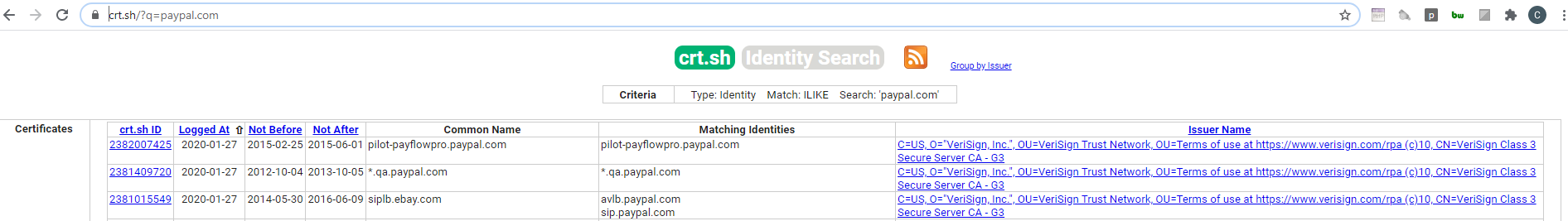 ์ด์ ์ โBrute-Forceโ ์ ๊ทผ๋ฒ์ ๋ถ๊ฐ๋ฅํ ์ ์์ง๋ง, Certificate Transparency ๋๋ถ์ ์ด๋ฌํ ํผ์ฑ ์๋๋ฅผ ์ฐพ์๋ด๋ ๊ฒ์ด ์ค์ ๋ก ๊ฐ๋ฅํฉ๋๋ค. CA๊ฐ ์ธ์ฆ์๋ฅผ ๋ฐํํ ๋๋ง๋ค ์ธ๋ถ ์ ๋ณด๊ฐ ๊ณต๊ฐ๋ฉ๋๋ค. ์ฆ, certificate transparency๋ฅผ ์ฝ๊ฑฐ๋ ๋ชจ๋ํฐ๋งํ๋ฉด ์ด๋ฆ ์์ ํค์๋๋ฅผ ํฌํจํ ๋๋ฉ์ธ์ ์ฐพ์๋ผ ์ ์์ต๋๋ค. ์๋ฅผ ๋ค์ด ๊ณต๊ฒฉ์๊ฐ https://paypal-financial.com์ ์ธ์ฆ์๋ฅผ ์์ฑํ๋ฉด, ์ธ์ฆ์๋ฅผ ํตํด โpaypalโ์ด๋ผ๋ ํค์๋๋ฅผ ์ฐพ์ ์์ฌ์ค๋ฌ์ด ์ฌ์ฉ์ ํ์ธํ ์ ์์ต๋๋ค.