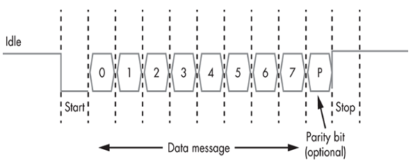 ์ผ๋ฐ์ ์ผ๋ก UART๊ฐ ์ ํด ์ํ์ผ ๋ ๋ผ์ธ์ ๋์ ์ํ(๋ ผ๋ฆฌ 1 ๊ฐ)๋ก ์ ์ง๋ฉ๋๋ค. ๊ทธ๋ฐ ๋ค์ ๋ฐ์ดํฐ ์ ์ก์ ์์์ ์ ํธํ๊ธฐ ์ํด ์ก์ ๊ธฐ๋ ์์ ๊ธฐ์ ์์ ๋นํธ๋ฅผ ์ ์กํ๋ฉฐ, ์ด ๋์ ์ ํธ๋ ๋ฎ์ ์ํ(๋ ผ๋ฆฌ 0 ๊ฐ)๋ก ์ ์ง๋ฉ๋๋ค. ๋ค์์ผ๋ก ์ก์ ๊ธฐ๋ ์ค์ ๋ฉ์์ง๋ฅผ ํฌํจํ๋ 5~8๊ฐ์ ๋ฐ์ดํฐ ๋นํธ๋ฅผ ์ ์กํ๊ณ , ๊ทธ ๋ค์ ์ ํ์ ํจ๋ฆฌํฐ ๋นํธ์ ํ๋ ๋๋ ๋ ๊ฐ์ ์ ์ง ๋นํธ(๋ ผ๋ฆฌ 1 ๊ฐ)๋ฅผ ์ ์กํฉ๋๋ค. ์ค๋ฅ ๊ฒ์ฌ์ฉ์ผ๋ก ์ฌ์ฉ๋๋ ํจ๋ฆฌํฐ ๋นํธ๋ ์ค์ ๋ก๋ ๊ฑฐ์ ๋ณด์ด์ง ์์ต๋๋ค. ์ ์ง ๋นํธ(๋๋ ๋นํธ)๋ ์ ์ก์ ๋์ ๋ํ๋ ๋๋ค.