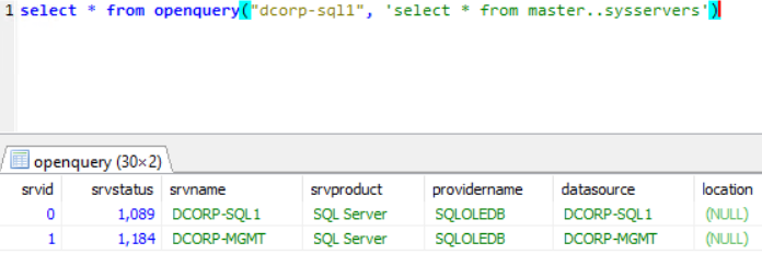 select * from openquery("dcorp-sql1", 'select * from master..sysservers')