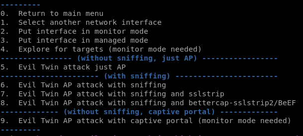 apt-get install sslstrip asleap bettercap mdk4 hostapd beef-xss lighttpd dsniff hostapd-wpe