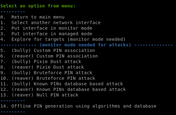 - Se WPS: Pixie dust attack e brute-force attack (cuidado: o brute-force attack pode levar muito tempo). Observe que ele não tenta null PIN ou database/generated PINs.