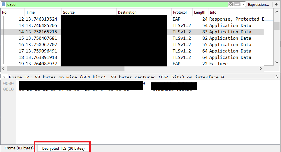 This method was tested in an PEAP connection but as I’m decrypting an arbitrary TLS tunnel this should also works with EAP-TTLS