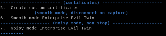 Airgeddon can use previously generated certificated to offer EAP authentication to WPA/WPA2-Enterprise networks. The fake network will downgrade the connection protocol to EAP-MD5 so it will be able to capture the user and the MD5 of the password. Later, the attacker can try to crack the password.Airggedon offers you the possibility of a continuous Evil Twin attack (noisy) or only create the Evil Attack until someone connects (smooth).