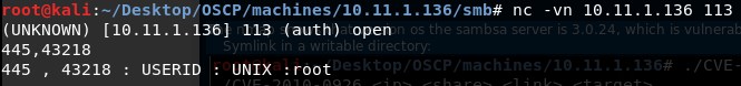 Se uma máquina estiver executando o serviço ident e samba (445) e você estiver conectado ao samba usando a porta 43218. Você pode descobrir qual usuário está executando o serviço samba fazendo: