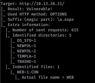 Você pode usar https://github.com/irsdl/IIS-ShortName-Scanner para testar essa vulnerabilidade:java -jar iis_shortname_scanner.jar 2 20 http://10.13.38.11/dev/dca66d38fd916317687e1390a420c3fc/db/