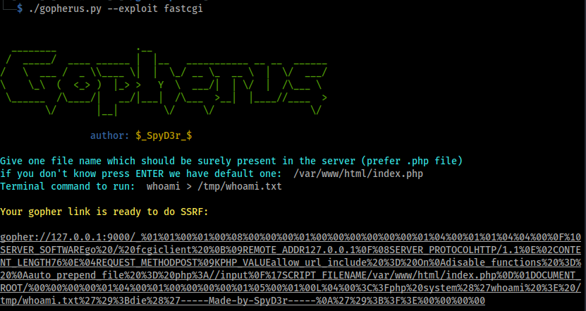 Usando Gopherus, você pode gerar um payload para enviar ao listener FastCGI e executar comandos arbitrários: