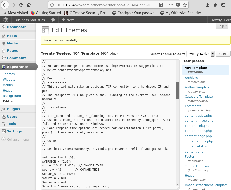 Arquivos de temas podem ser encontrados em /wp-content/themes/, então se você alterar algum php do tema para obter RCE você provavelmente usará esse caminho. Por exemplo: Usando o tema twentytwelve você pode acessar o arquivo 404.php em: /wp-content/themes/twentytwelve/404.php