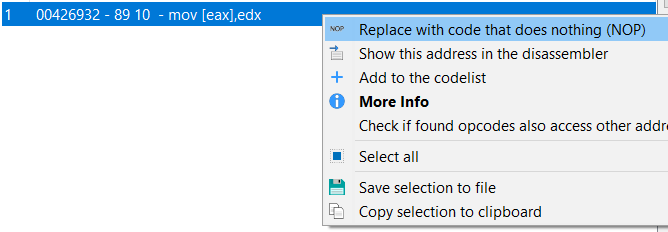 Agora que você encontrou o endereço que está modificando o valor, você pode modificar o código à sua vontade (Cheat Engine permite que você o modifique para NOPs rapidamente):
