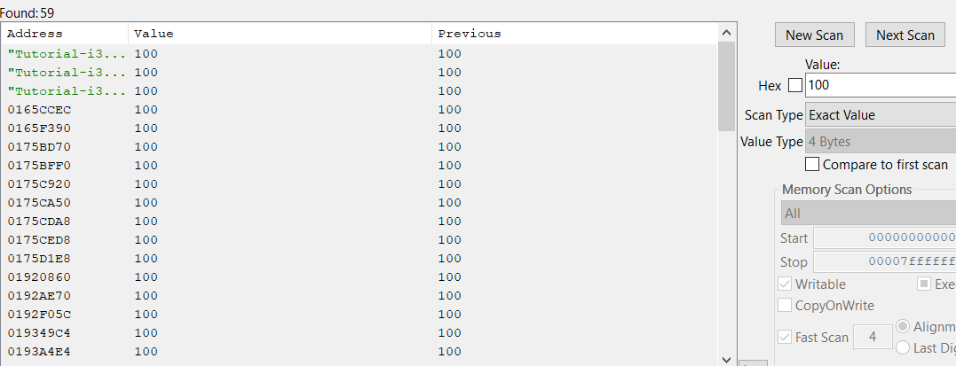Supondo que você está procurando o valor 100, você realiza um escaneamento buscando por esse valor e encontra muitas coincidências: