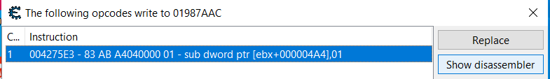 Seguindo os passos anteriores, encontre onde o valor que você está interessado está. Então, usando “Descobrir o que escreve neste endereço”, descubra qual endereço escreve esse valor e clique duas vezes nele para obter a visualização da desassemblagem: