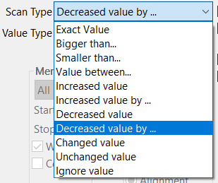Em seguida, faça o valor mudar, indique como o valor mudou (no meu caso, foi diminuído em 1) e realize um próximo escaneamento: