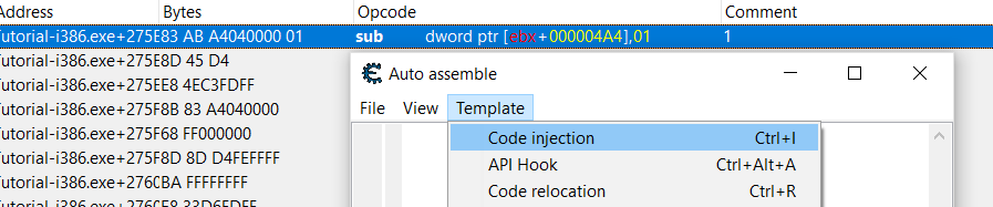 Em seguida, clique CTRL+a para invocar a janela de Auto assemble e selecione Modelo –> Injeção de Código