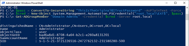 A senha em texto claro pode ser usada para realizar autenticação regular como a conta de confiança, uma alternativa a solicitar um TGT usando a chave secreta Kerberos da conta de confiança. Aqui, consultando root.local a partir de ext.local para membros do Domain Admins: