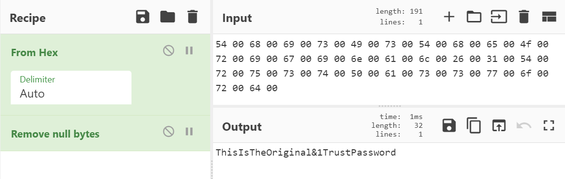 A senha em texto claro pode ser obtida convertendo a saída [ CLEAR ] do mimikatz de hexadecimal e removendo bytes nulos ‘\x00’: