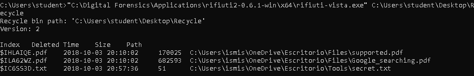 Bu dosyalara sahip olduğunuzda, silinen dosyaların orijinal adresini ve silindiği tarihi almak için Rifiuti aracını kullanabilirsiniz (Vista – Win10 için rifiuti-vista.exe kullanın).