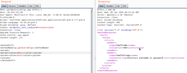 wp.getUserBlogs, wp.getCategories veya metaWeblog.getUsersBlogs credentials’ı brute-force etmek için kullanılabilecek yöntemlerden bazılarıdır. Eğer bunlardan herhangiğini bulursanız şu şekilde bir şey gönderebilirsiniz: