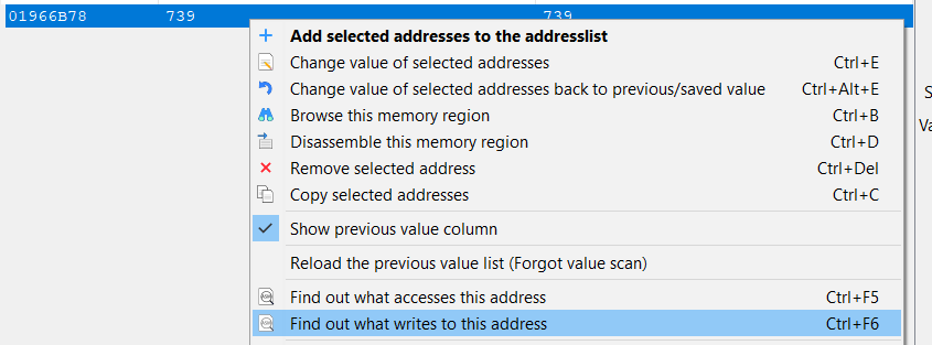 Bahsedilen bazı ipuçlarını kullanarak, mevcut oyununuzun önemli değeri sakladığı adresi bulun. Sonra (isterseniz oyunu durdurarak) bulunan adrese sağ tıklayın ve “Bu adrese erişenleri bul” veya “Bu adrese yazanları bul” seçeneğini seçin:
