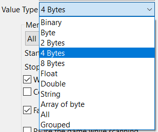 Genellikle sayılar 4bayt formatında saklanır, ancak bunları double veya float formatlarında da bulabilirsiniz veya bir sayıdan farklı bir şey aramak isteyebilirsiniz. Bu nedenle, neyi arama yapmak istediğinizi seçtiğinizden emin olmalısınız: