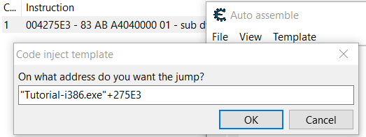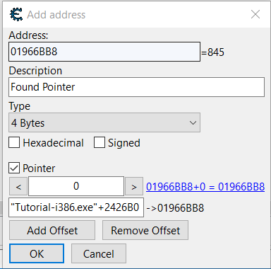 Şimdi, “Gösterici” onay kutusuna tıklayın ve metin kutusuna bulunan adresi ekleyin (bu senaryoda, önceki resimde bulunan adres “Tutorial-i386.exe”+2426B0 idi):