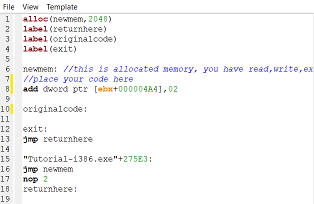 Bu nedenle, yeni assembly kodunuzu “newmem” bölümüne ekleyin ve orijinal kodu “originalcode” bölümünden kaldırın, eğer çalıştırılmasını istemiyorsanız. Bu örnekte, enjekte edilen kod 1 çıkarmak yerine 2 puan ekleyecektir: