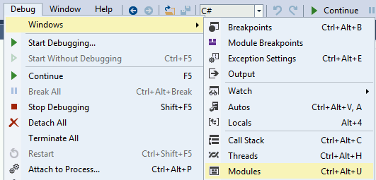 Artık süreci hata ayıklıyorken, durdurma zamanı ve tüm modülleri yükleme zamanı. Önce Debug >> Break All seçeneğine tıklayın ve ardından Debug >> Windows >> Modules seçeneğine tıklayın: